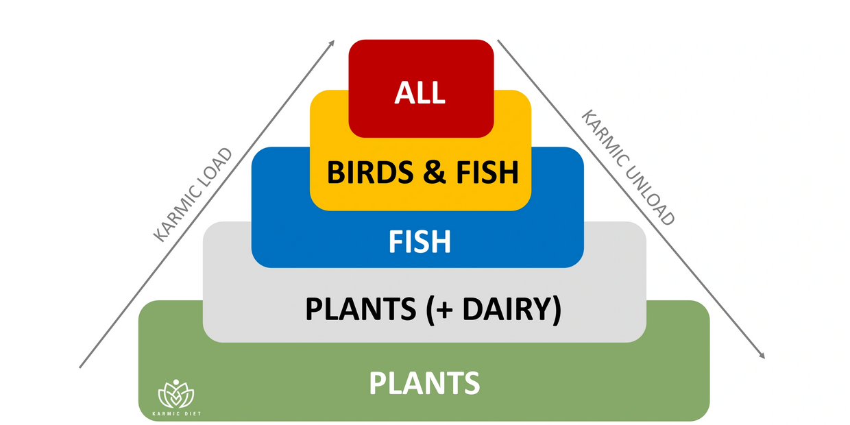 Different foods exhibit a different Karmic impact or said to carry a different Karmic load on humans. Thousands of years of documented work and discussion in this area shows that mammals (including dairy) may contain the highest Karmic load, followed by birds, fish and plants.